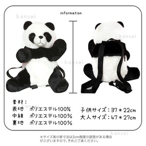 手軽に持ち運べる軽量仕上げのパンダバックパックです。かわいらしいパンダのデザインで、男の子や女の子、幼児から大人まで幅広くお使いいただけます。保育園や幼稚園、通学や通園にも最適なサイズ感で、たくさん入る収納力も魅力です。柔らかい素材で肩への負担も軽減し、長時間の着用でも快適な仕様となっています。